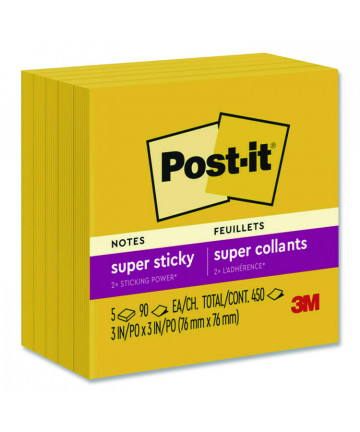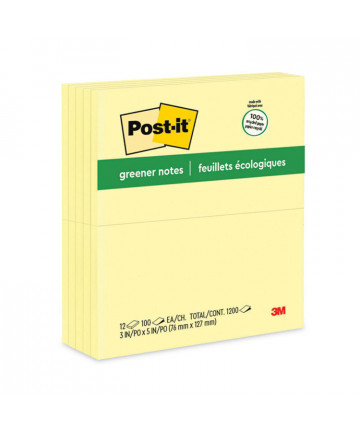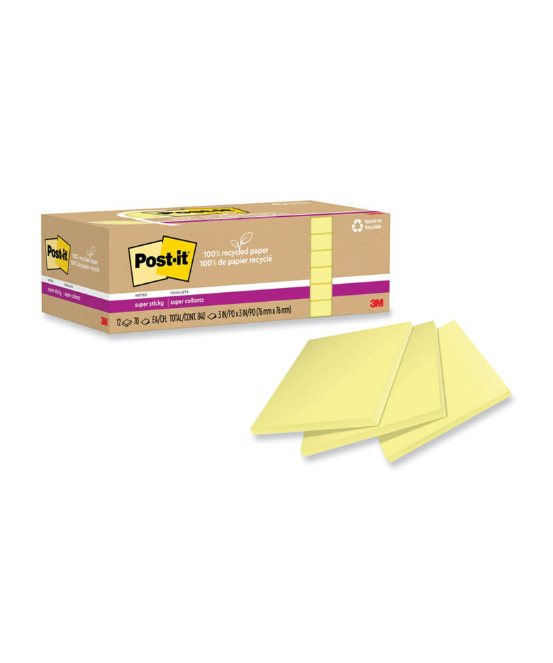 100% Recycled Paper Super Sticky Notes, 3" x 3", Canary Yelow, 70 Sheets/Pad, 12 Pads/Pack