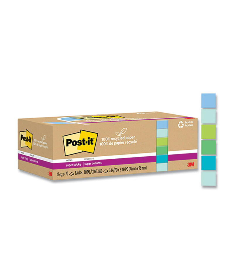 100% Recycled Paper Super Sticky Notes, Unruled, 3" x 3", Assorted Oasis Colors, 70 Sheets/Pad, 12 Pads/Pack