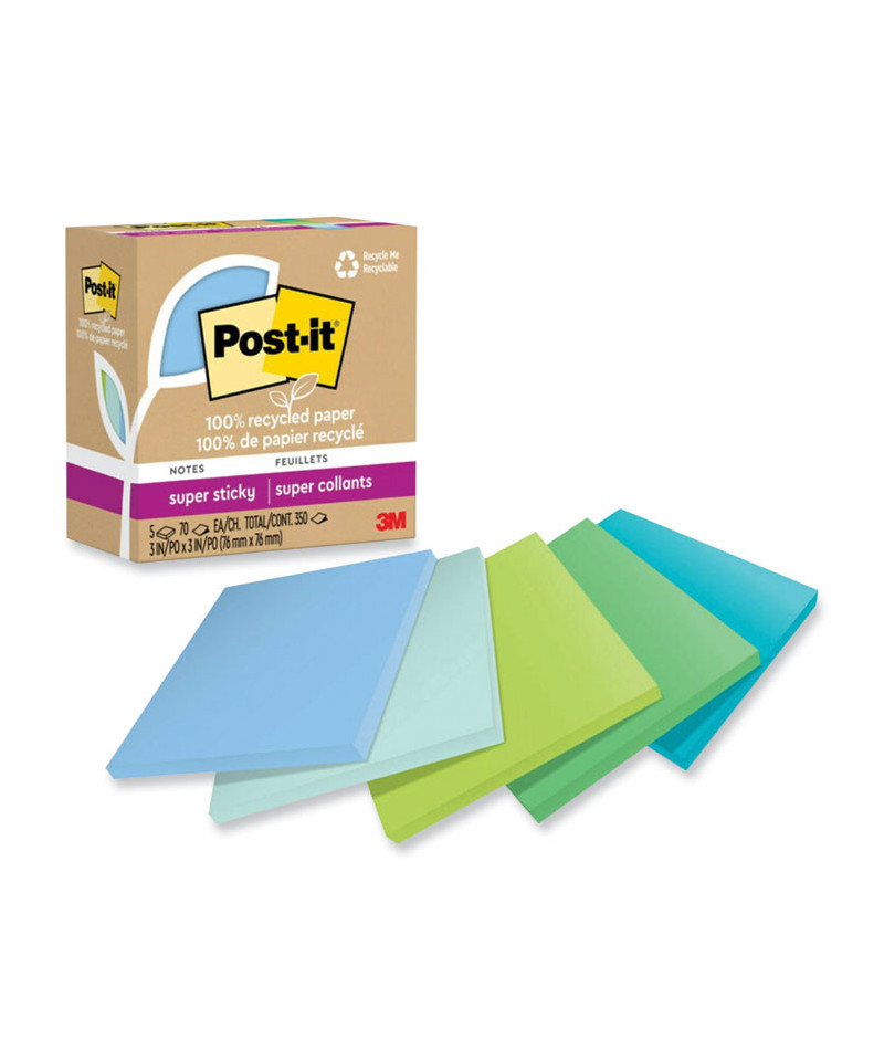 Post-it 100% Recycled Paper Super Sticky Notes are made from 100% recycled paper and feature two times the sticking power to make sure your message stays put. The water-based adhesive reliably sticks to doors, windows and walls, so you can take your to-do list anywhere. Succeed in your everyday tasks and feel good knowing these notes are made in a zero-waste-to-landfill plant. Packaging is also made from 100% recycled paper.