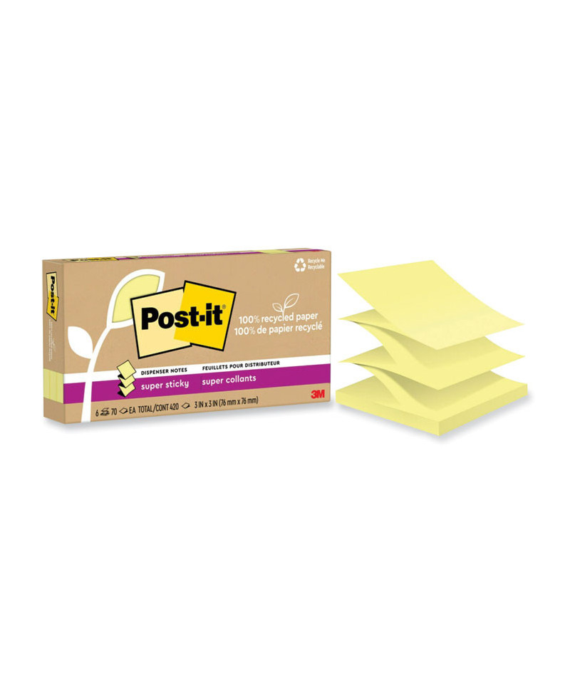 100% Recycled Paper Super Sticky Notes, 3" x 3", Canary Yellow, 70 Sheets/Pad, 6 Pads/Pack