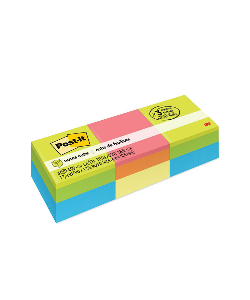Post-it® Notes Cubes are great to have on your desk or counter so you never run out of notes for great ideas. They stick securely and remove cleanly, featuring a unique adhesive designed for use on paper. More notes per pad than any other Post-it® Note. The colors add a pop of style to your desk. Post-it® Notes are recyclable.