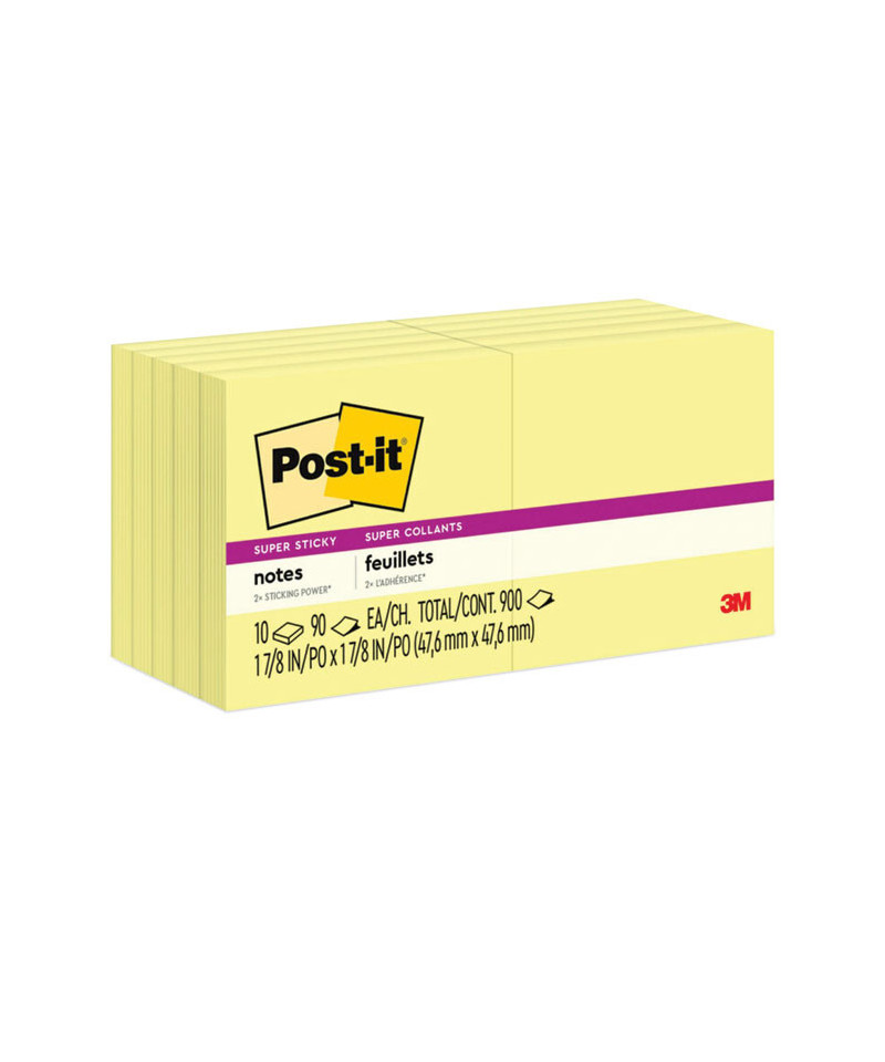 Experience the power of 2X stickiness. Super Sticky Notes stick to practically everything, everywhere! Revolutionary technology ensures your notes will stick securely to most surfaces yet remove cleanly! Versatile and essential, they're the perfect solution for lists, reminders, color-coding, labeling, brainstorming, storyboarding and even mural art. As they adhere firmly to walls, windows, doors, worksurfaces, mirrors and more, you can stick and restick these classic Canary Yellow notes wherever they're most likely to be noticed. To enhance your note-taking experience, download the free Post-it® App to your smartphone or tablet and instantly capture, save and share your important notes.