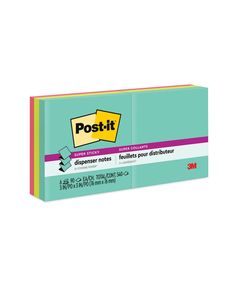 Post-it® Super Sticky Dispenser Notes in 3 x 3 feature 2x the sticking power. These accordion-style notes are specially designed to work in Post-it® Note Dispensers, and allow you to always have a note nearby to capture great ideas. Unique adhesive reliably sticks and re-sticks so your message can stay front and center. Move your notes with you throughout the day. Use for notes or reminders on doors, windows or walls. Colorful hues brighten your day. Post-it® Super Sticky Dispenser Notes are recyclable.