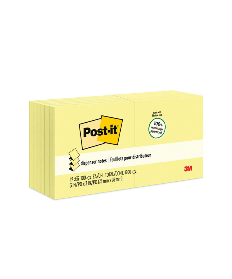 Post-it® Notes Greener Original Recycled Pop-up Notes are made entirely of recycled paper with a plant-based adhesive, which means no new trees were used. The plant material used to make the adhesive was replenished after harvesting. Accordion-style notes pop-up, one-by-one, from a Post-it® Note Dispenser (dispenser sold separately). Repositionable adhesive sticks securely and removes cleanly. They're great for reminders and short to-do lists.