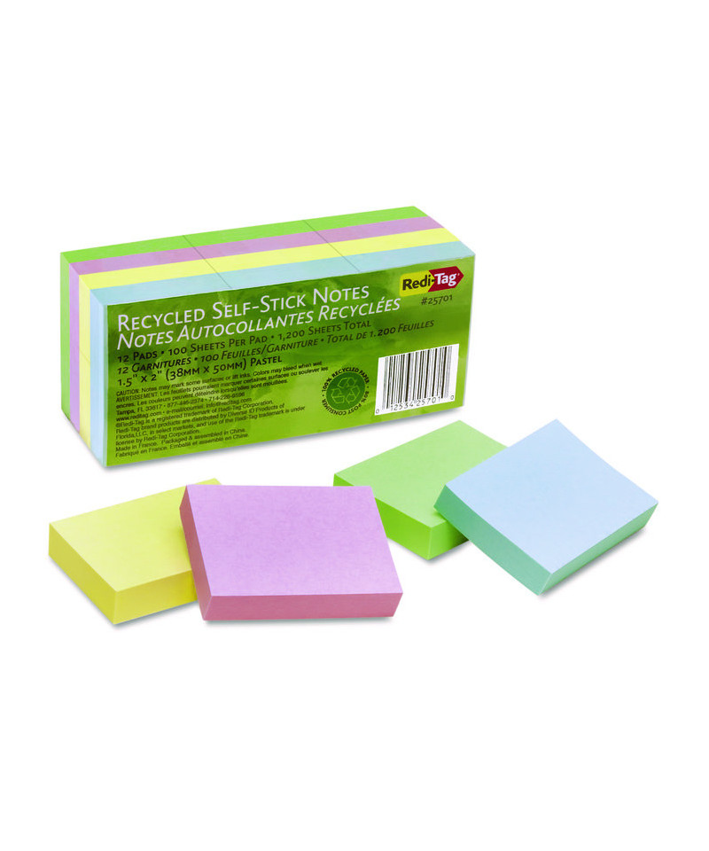 Self-stick, repositionable notes stay stuck until you decide it's time to move. Recycled content makes them environmentally preferrable when compared to their traditional counterparts.