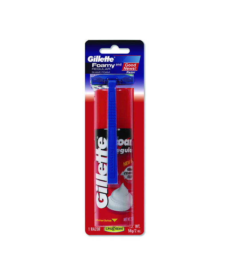 Shave Kit is TSA approved for travel. Kit contains one Gillette GoodNews two-blade disposable razor and one 2 oz can of Foamy Regular shave cream.