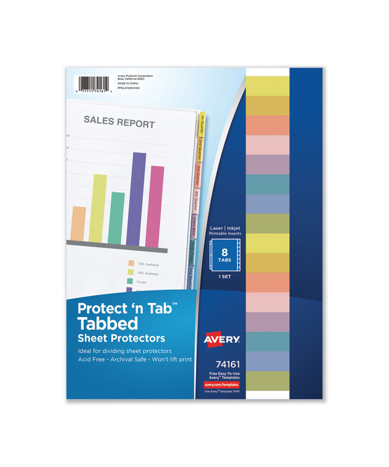 These Protect 'n Tab™ Tabbed Sheet Protectors feature convenient tabs on the side of the pages to help you find the page or section you're looking for quickly. Included white or color tab inserts can be labeled by hand or printed on your printer. Use free designs and templates from Avery Design & Print to create professional-looking tab labels. The sheet protectors fit 8 1/2" x 11" material and are acid-free and archival safe to keep your pages looking sharp and impressive.