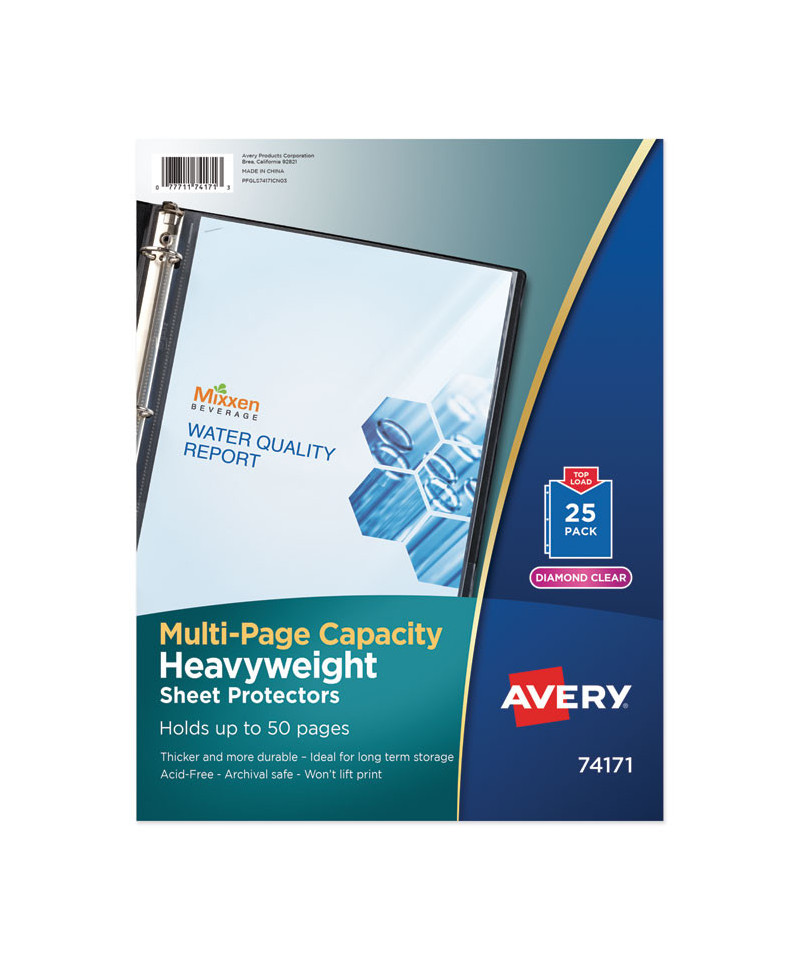 Sheet protectors have room for up to 50 pages, making them ideal to store and protect stacks of paper, bound booklets and more. Ideal for long-term storage, non-stick polypropylene material is acid-free and won't lift print. Easy Load feature makes inserting sheets fast and easy. Top loading-no need to punch inserts. Durable material holds your inserts securely and is tough enough to withstand frequent use in your three-ring binder. Stow that report, brochure or program with confidence, knowing these sheet protectors are on the job.