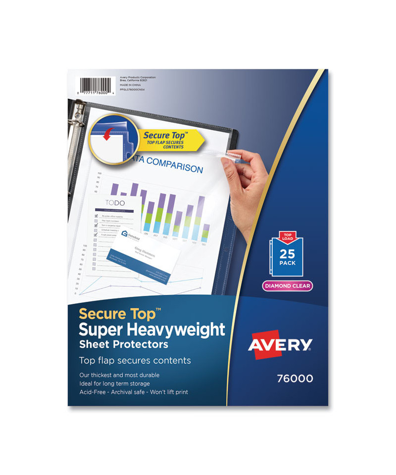 If you're looking for tip-top protection for your documents, look no further than these Secure Top™ Sheet Protectors. Each sheet protector features a convenient top flap that secures the contents, so you can store papers in nonstandard sizes with confidence and rest easy knowing your important document won't accidentally slip out of its protective sleeve. Diamond-clear material delivers a crisp view of your pages. Super heavyweight polypropylene is designed to withstand frequent use in your binder and is acid-free and archival-safe to provide long-term protection. Protects 8 1/2" x 11" insert sheets and smaller items. For clarity, security and strength, it's hard to top these sturdy sheet protectors.