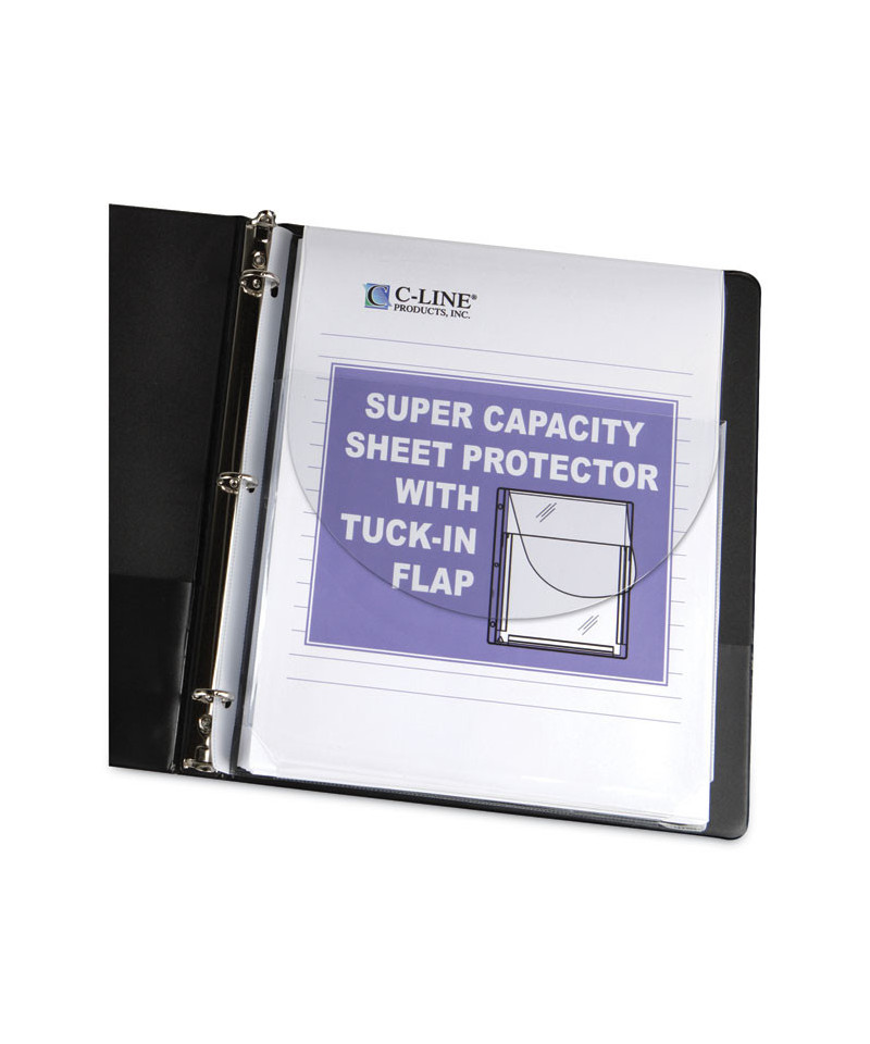 Store catalogs, magazines, presentations and more in a standard three-ring binder with this document holder. Use the Super Capacity Sheet Protector to store a lot of paperwork in a compact space within three-ring binders. Durable, heavy-duty vinyl pocket keeps documents safe. Handy three-hole punched construction let you fit projects easily into a binder and still protect against dirt and spills. Gusseted pocket expands to store growing files. Tuck-in flap secures papers and documents inside pocket. Holds up to 200 letter-size sheets.