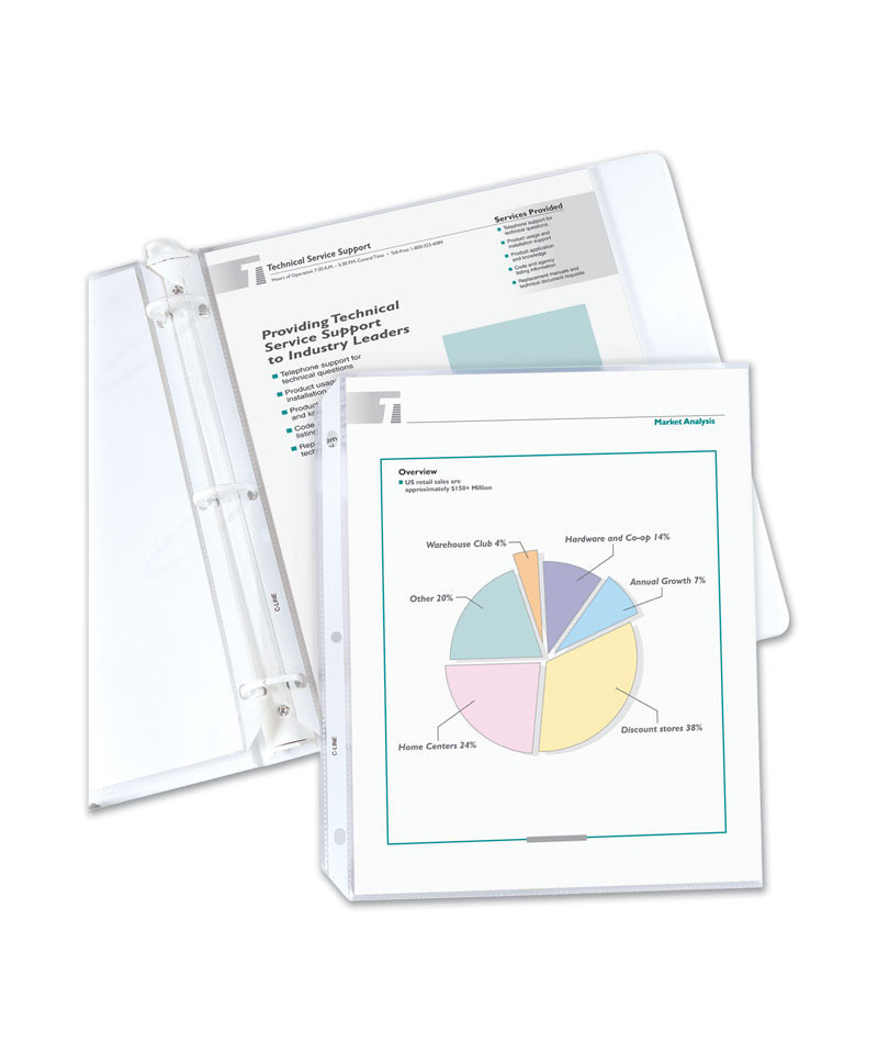 Strong, reinforced edges prevent tears. Top-loading sheet protectors are pre-punched to fit standard three-ring binders. Acid-free polypropylene eliminates photocopy transfer and provides a good storage option for documents.