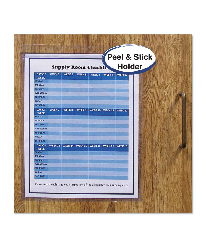 Peel and stick holders stick to any smooth, nonporous surface. Just peel away the back liner and expose the adhesive when you wish to post job tickets, service records, inventory data and storage instructions. They're also ideal for displaying maintenance schedules, notices, logs and more throughout industrial and commercial facilities. Super-heavyweight, PVC-free poly construction and welded, non-rip seams provide the enhanced durability required for rough-handling environments.