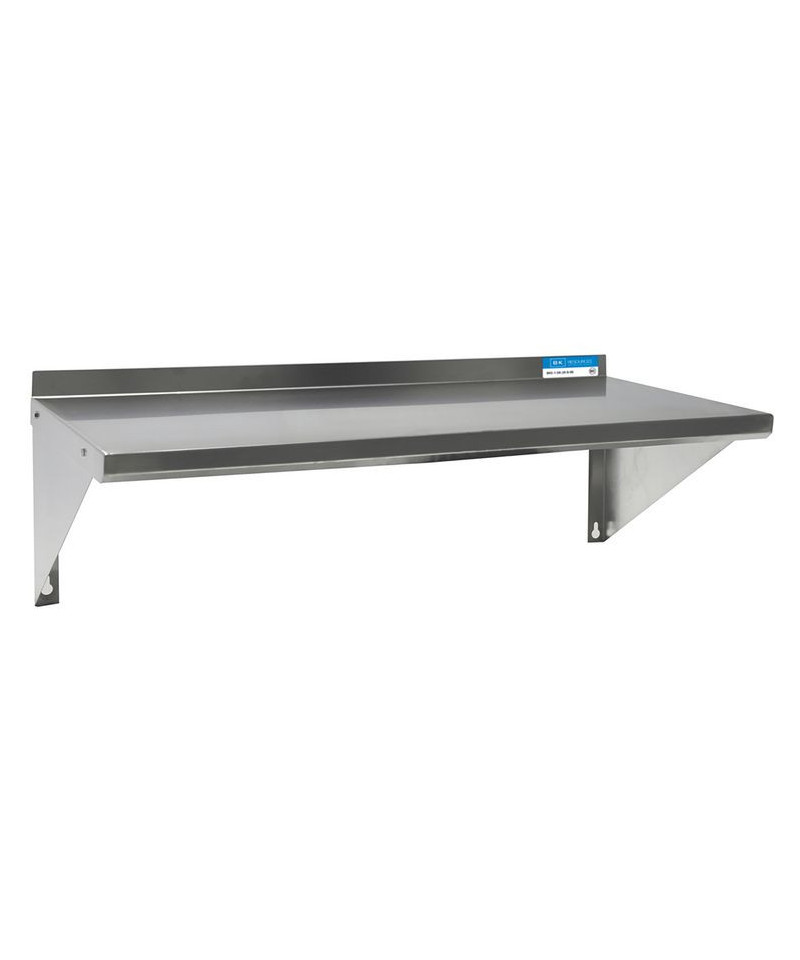 This wall-mounted shelving solution is constructed from durable 18-gauge T-430 stainless steel. It features a 1.5" rear turn-up for added stability and is supported by two 8" angle supports, providing a robust and space-efficient storage option.