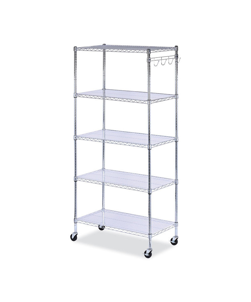 Ideal storage solution for commercial use. Snap-together design assembles in minutes. Strong welded wire construction provides exceptional strength and stability. Open design allows air circulation and reduces dust build-up. Includes five shelves, posts, shelf clips, shelf liners, casters, hooks and leveling glides (if used without casters). Up to 600 lbs per shelf (evenly distributed) when used without casters. Casters (two locking) provide mobility and can be omitted to increase weight capacity of unit.