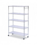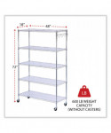 Ideal storage solution for commercial use. Snap-together design assembles in minutes. Strong welded wire construction provides exceptional strength and stability. Open design allows air circulation and reduces dust build-up. Includes five shelves, posts, shelf clips, shelf liners, casters, hooks and leveling glides (if used without casters). Up to 600 lbs per shelf (evenly distributed) when used without casters. Casters (two locking) provide mobility and can be omitted to increase weight capacity of unit.