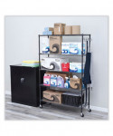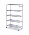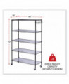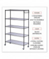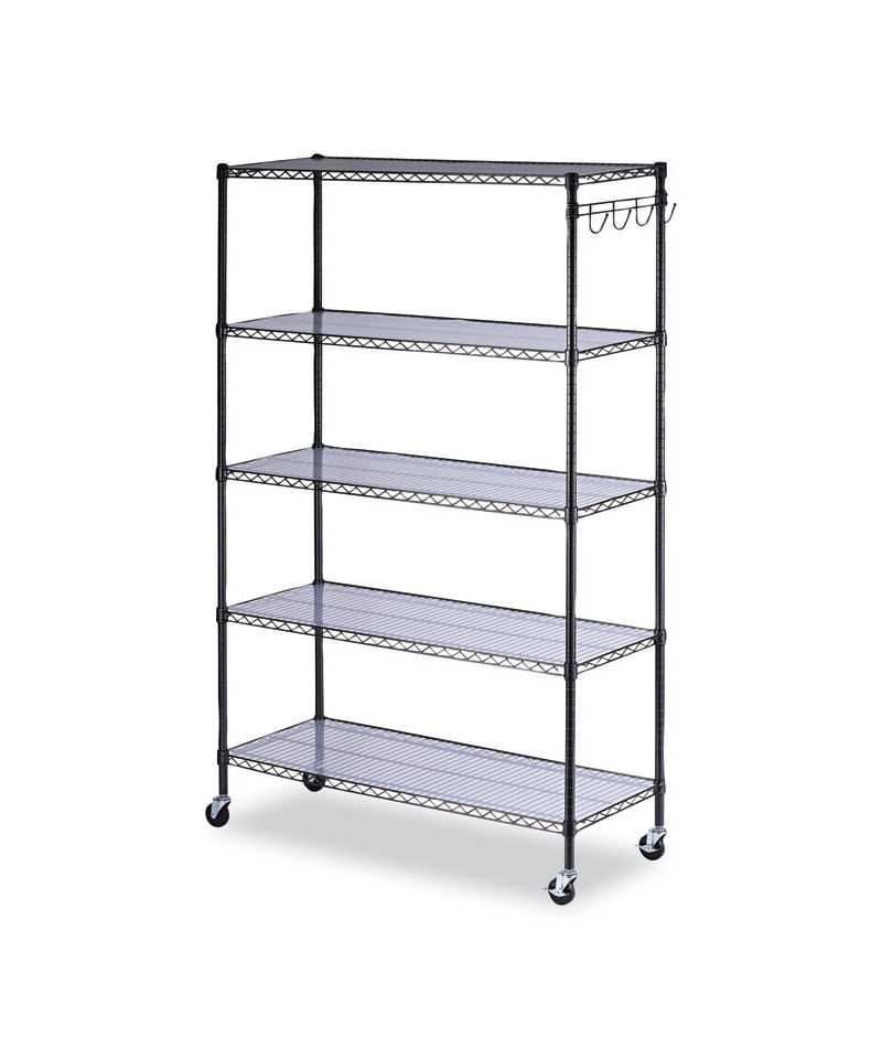 Ideal storage solution for commercial use. Snap-together design assembles in minutes. Strong welded wire construction provides exceptional strength and stability. Open design allows air circulation and reduces dust build-up. Includes five shelves, posts, shelf clips, shelf liners, casters, hooks and leveling glides (if used without casters). Up to 600 lbs per shelf (evenly distributed) when used without casters. Casters (two locking) provide mobility and can be omitted to increase weight capacity of unit.