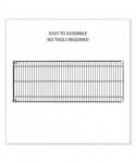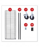 Open, snap-together design. Strong welded wire construction. Includes five shelves, posts, shelf liners, hooks, casters and level glides (for use without casters). Ideal for business, commercial or food-service applications.