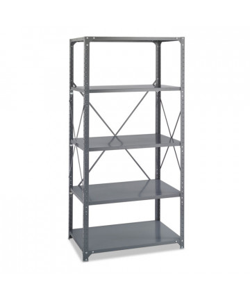 Designed for heavy-duty use, this shelving unit assembles in minutes with no bolts required due to its slide-together design requiring just a rubber mallet. Its powder-coated steel finish resists rust and holds up in demanding environments. Rugged particle-board shelves drop securely into place and adjust in 1.5" increments to accommodate items of varying heights. Configure the unit horizontally or vertically to meet evolving storage needs.