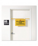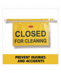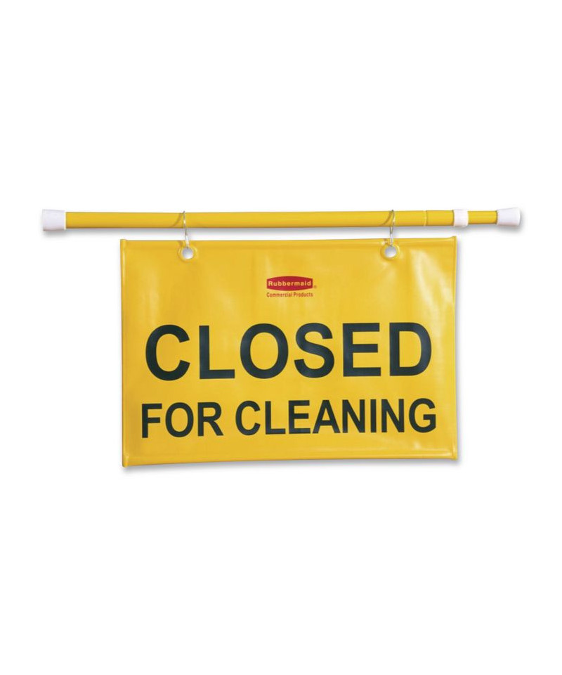 The Rubbermaid Commercial Hanging Safety Sign, "Closed for Cleaning" is mounted on a twist-action pole that extends up to 50" wide to prevent entry through even wide hospital doors. This safety sign is made of a soft, pliable material that rolls around the pole for easy storage when not in use. The color is both ANSI and OSHA-compliant.