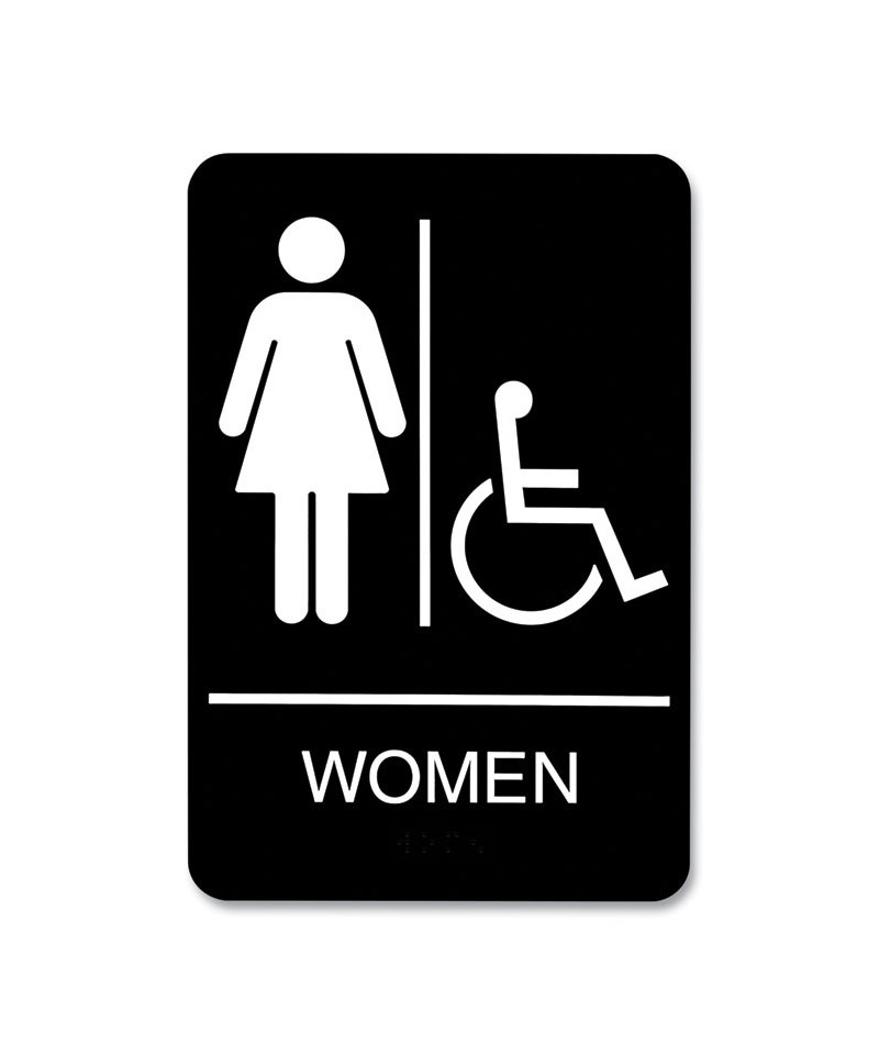 Universally and easily recognizable white graphics. Raised tactile graphics with Grade 2 Braille. Meets Americans with Disabilities Act (ADA) requirements. Includes double-side adhesive tape for mounting to door or wall.