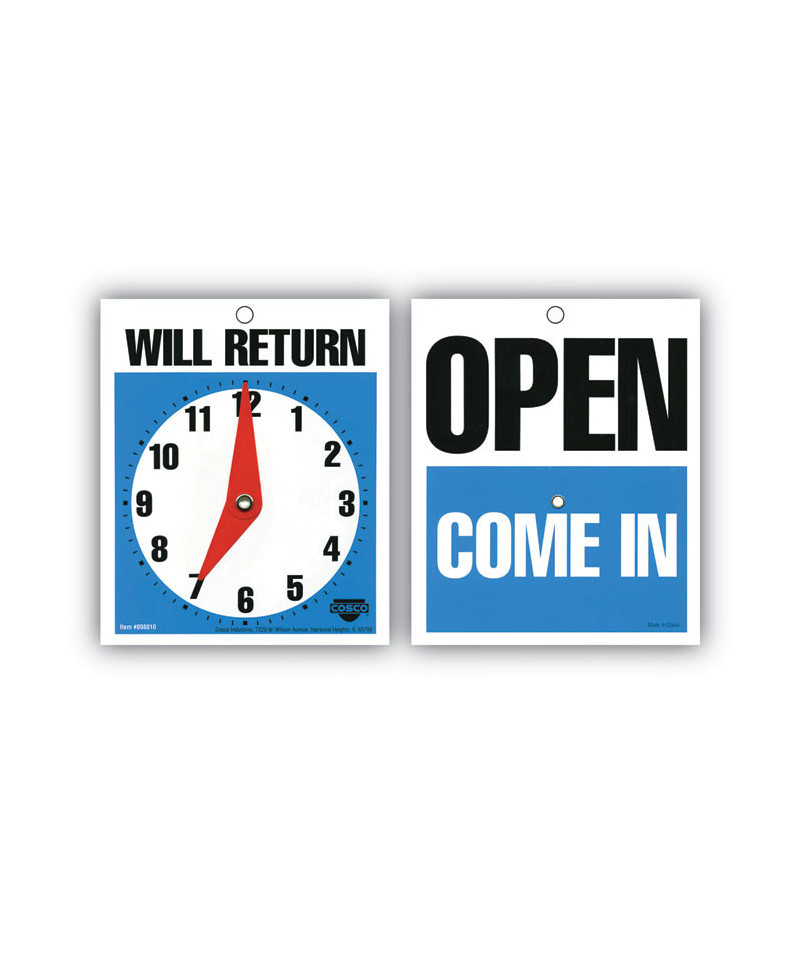 Keep customers informed with the COSCO Will Return Later Sign, designed to clearly display when you will be back from a temporary absence. Featuring a pre-printed message with an adjustable clock face, this sign makes it simple to set return times that visitors can easily see. Constructed from durable, tear-resistant plastic, it is lightweight yet strong enough for everyday use. Easy to hang on doors or windows, this professional sign is perfect for retail stores, service counters, and offices that want to maintain communication and customer satisfaction, even when temporarily closed.