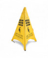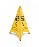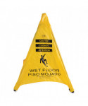 Safety cone with trilingual language and wet floor symbol on all three sides is collapsible and quickly sets up. The caution sign features the wet floor symbol and "WET FLOOR" in English and Spanish. Also features the word "CAUTION" in English, Spanish, and French for effective communication. Features a wall-mounted storage tube that can be strategically positioned in a variety of locations for ease of accessibility when a spill occurs. Lightweight and durable, it folds compactly into the wall-mountable tube when not in use for easy storage. Bright yellow color is highly visible and seen from a distance. Made from durable, water-resistant materials to prevent damage to the sign.