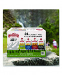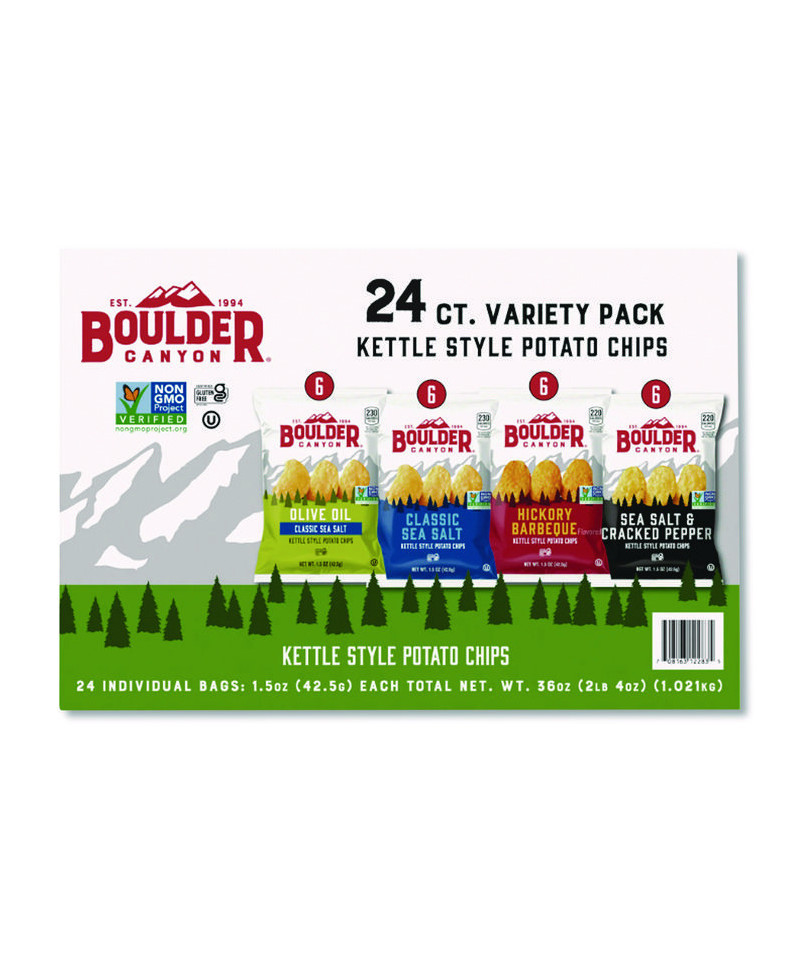 Contains four delicious flavors of kettle cooked chips. Includes six hickory barbeque chips, six sea salt chips, six sea salt and cracked pepper chips, and six olive oil chips.