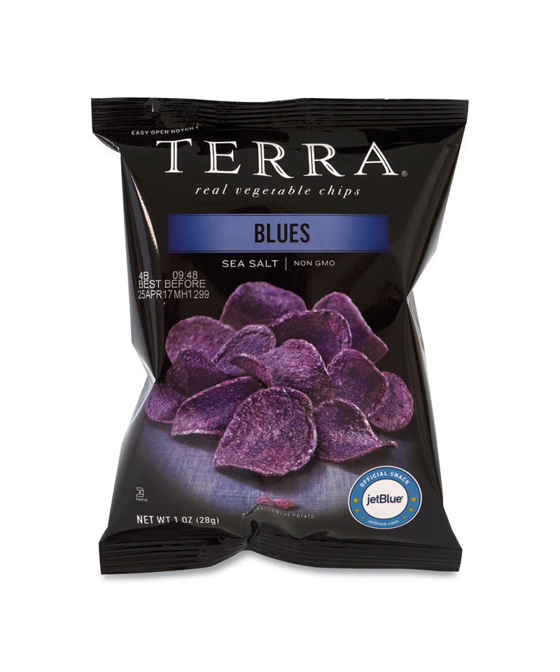 These naturally made potato chips are simply unforgettable. Terra Real Vegetable Chips Blue are made with real blue potatoes, and are a bluish-purple color with a slightly nutty flavor. These GMO-Free and Gluten-Free chips are a healthier way to snack. So whether you're filling up on healthy snacks for lunch, or throwing a few in the car or pantry, there are plenty of Terra Chips to go around!