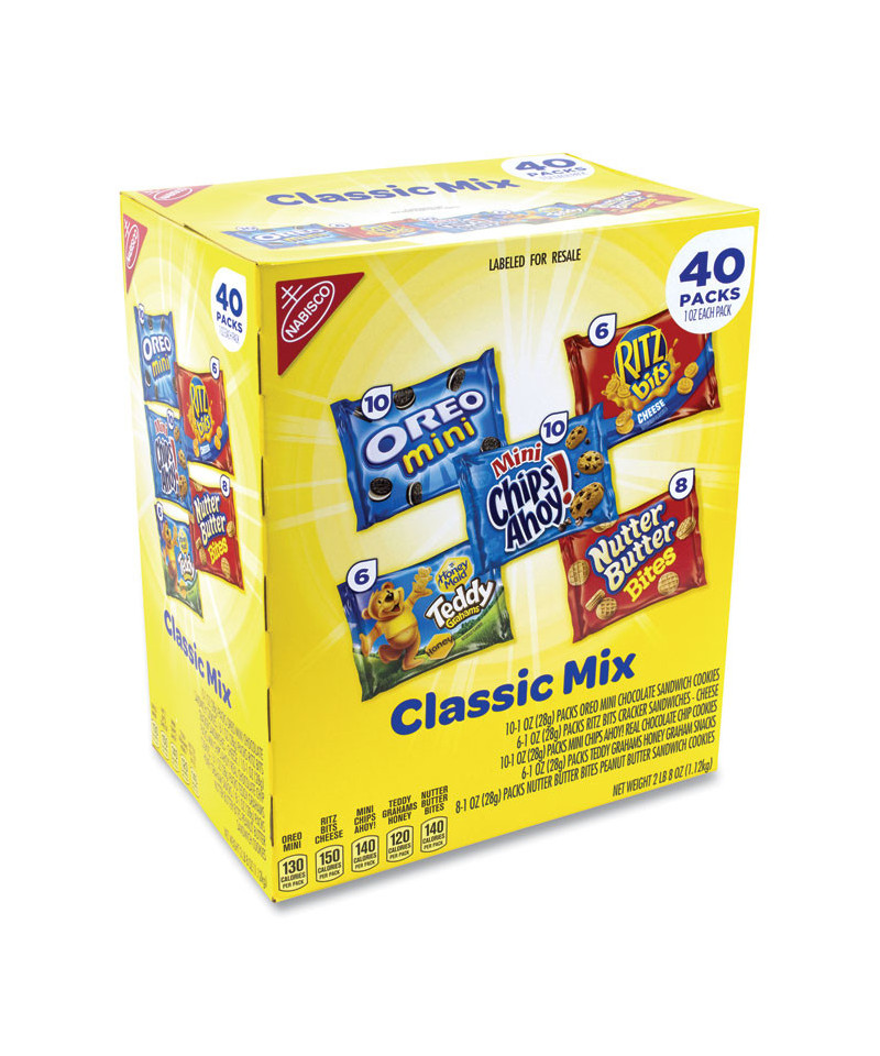 Grab a pack from this Nabisco Classic Mix box and crunch your way through one of five delicious flavors. Comes with individual serving pouches of Oreo Minis, Ritz Bits, Mini Chips Ahoy, Nutter Butter Bites, and Teddy Grahams. This variety pack is perfect for a quick snack at home or at work, and is great for parties. Nabisco Cookie & Cracker Classic Mix has a little bit of everything for an on-the-go snacker!