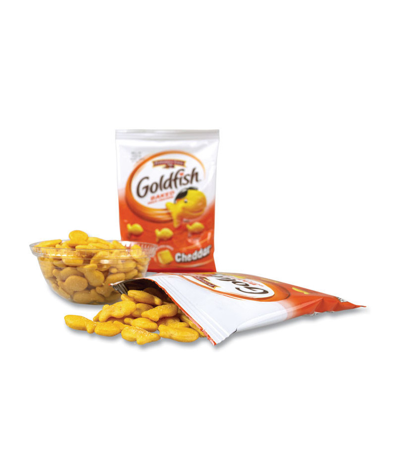 Swim through your afternoon with tasty baked snack crackers in your favorite fishy shapes. Baked crackers have zero grams trans fat. Yummy cheddar cheese flavor. Let these little fishies brighten up your day; they're the only snack that smiles back!
