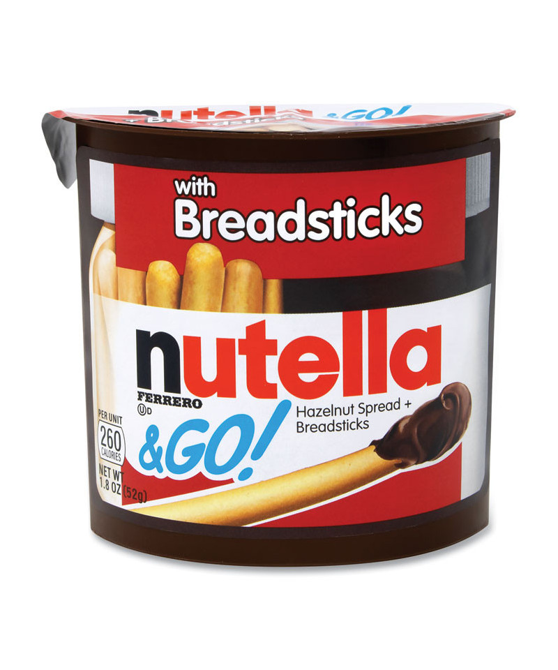 Snack deliciously with creamy, sweet and satisfying Nutella® & Go! spread-and-breadsticks combo. Hazelnut spread is made entirely with hazelnuts, skim milk and cocoa— no artificial colors, no preservatives. Convenient single-serving tub.