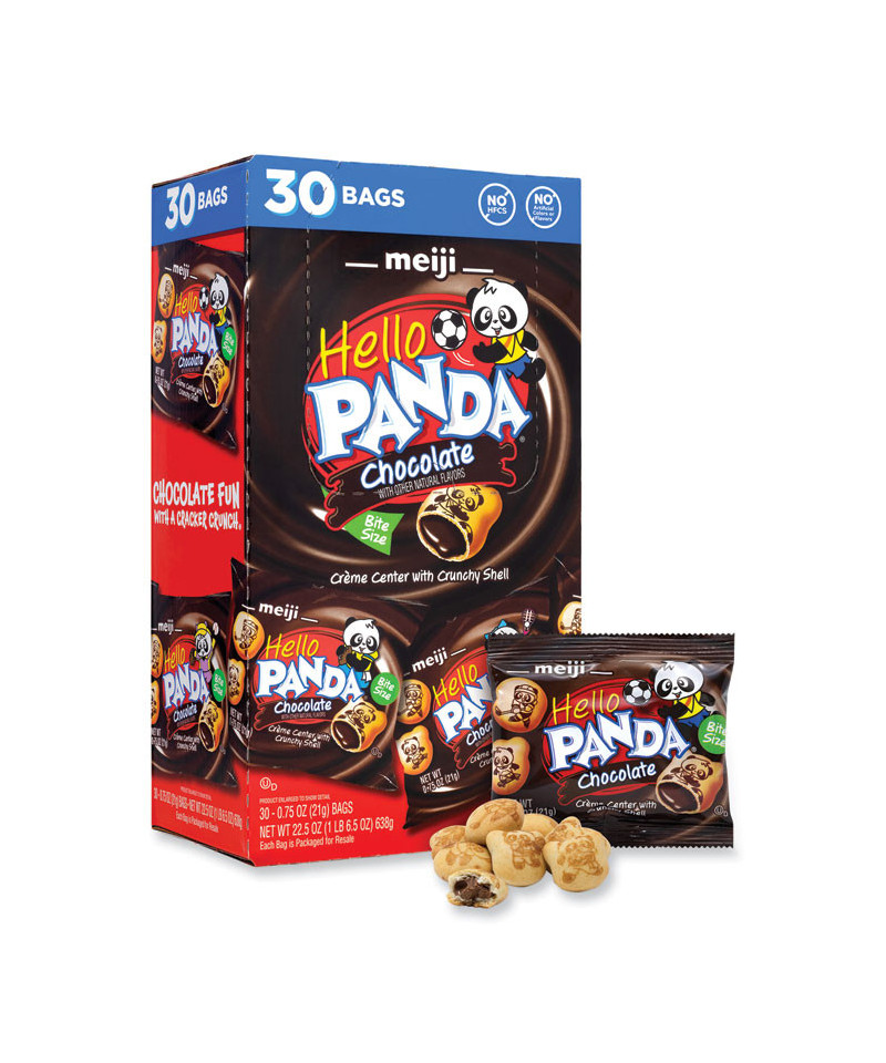 Bite-sized, crunchy shells with chocolate creme centers. Each shell is printed with a drawing of the cute Hello Panda enjoying various sports. These Meiji Hello Panda Cookie boxes are great for on-the-go snacking. Ideal for kids' lunches or team snacks.