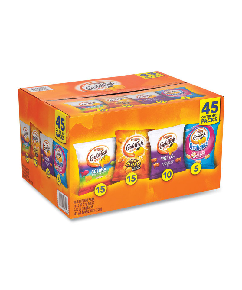 The Snack that Smiles Back when it comes to Goldfish crackers, you can feel good about serving your favorite snacks. All of the cheese varieties are baked with real cheese, and Goldfish crackers are made with no artificial preservatives or flavors. Featuring Goldfish Colors, Flavor Blasted X-tra Cheddar, Pretzel and Vanilla Cupcake pouches.