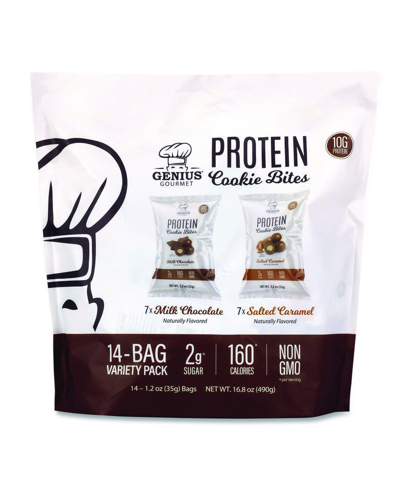 Perfect for anyone looking for healthy protein snacks that taste like a treat. Ditch the protein shake and reach for Genius Gourmet's Milk Chocolate and Salted Caramel Protein Cookie Bites! With 10 g of protein, 0 g added sugar, and non-GMO ingredients, satisfy your sweet cravings with these protein sweets.