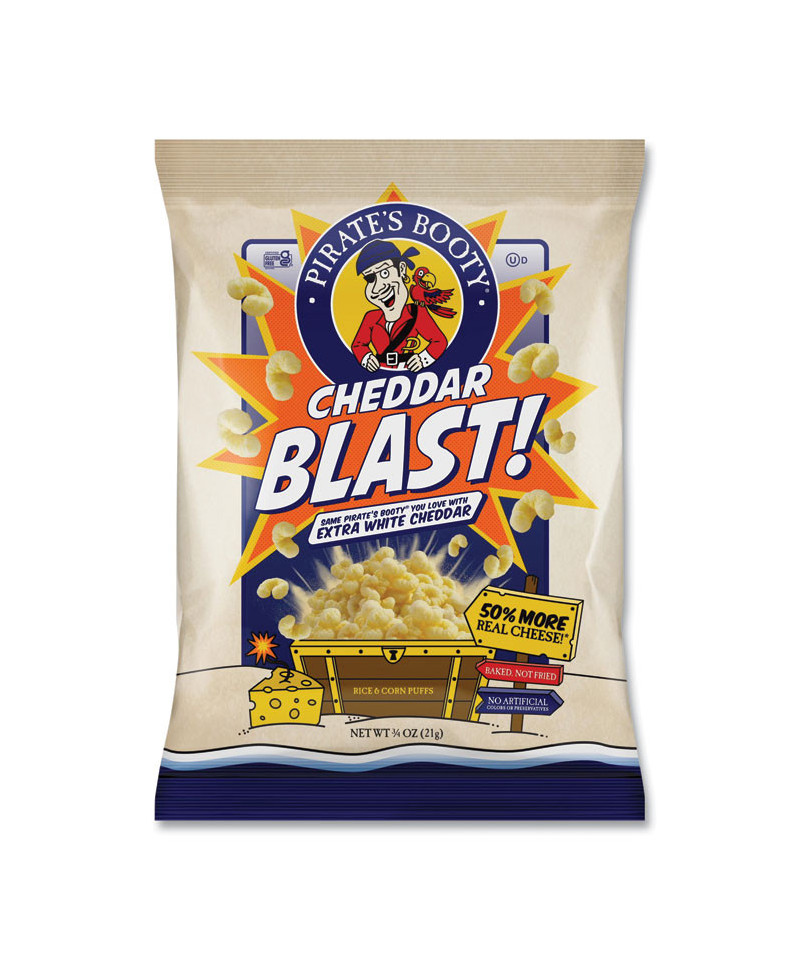 Drop the anchor and discover Pirate's Booty. Deliciously baked, never fried, rice and corn puffs made with aged white cheddar cheese. Real, tasty ingredients that are easy to pronounce make for a snack that's a real treasure!