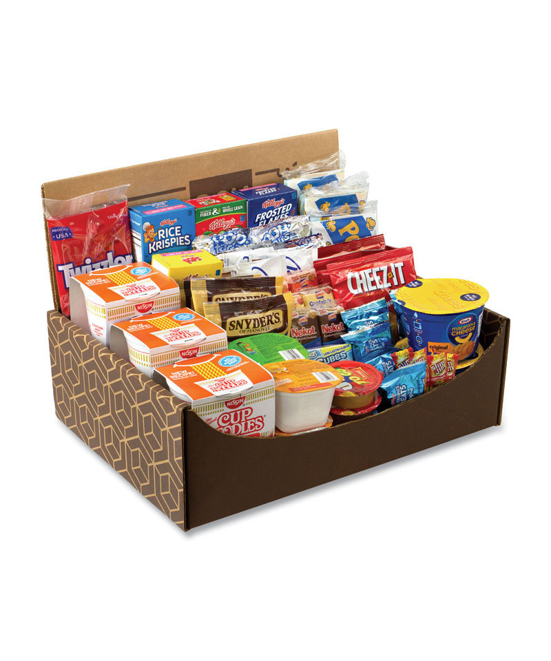 Get ready for a new year with this Dorm Room Survival Snack Box. Great to send to the student in your life, or get to fill up your own dorm! Each box contains 55 snacks of all kinds. Eat your way through popcorn, pretzels, poptarts, crackers, cereal and other great snacks whenever hunger hits. Dorm Room Survival Snack Box contains Maruchan Chicken, Mac and Cheese Cups, Kellogg's Cereal Boxes, Jif-To-Go Dippers, Pop Secret Popcorn, Rice Krispies Treats, Slim Jims, Lance Crackers, Cheez Its, Pringles, Carnation Instant Breakfast Pouches, Snyders Mini Pretzels, Poptarts, Twizzler Pouch, Ice Cube Gum. Products may vary by flavor per brand and substitutions may be made due to availability.