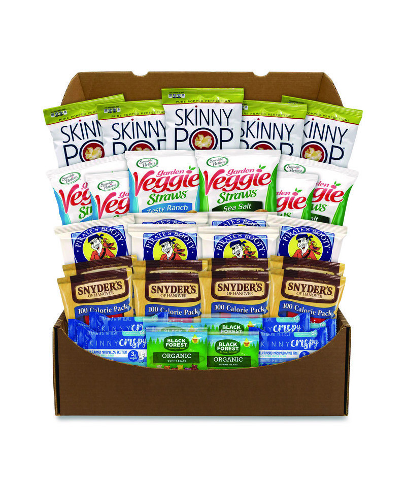 Want to enjoy crunchy, delicious snacks without overloading on sugar? This Healthy Snacks Box is packed with mouthwatering salty, crunchy and chocolaty healthy snacks! With Stonyfield Fruit Snacks, Skinny Crispy, Pirate's Booty, Skinny Pop, Veggie Straws and Snyder's Mini Pretzels, this snack assortment is great for sharing in the office breakroom! Grab a snack from this assortment when you're on your commute, at your desk or with your lunch and enjoy the delicious flavor of these healthy snacks. Products may vary by flavor per brand and substitutions may be made due to availability.