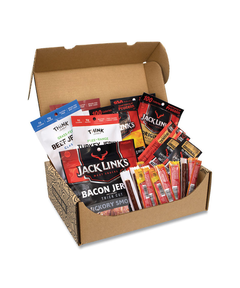 Looking for delicious tasting beef jerky, packed with protein in a variety of flavors? This Big Beef Jerky Box is bursting with great Jack Links, Krave and Slim Jim Beef Jerky. With 29 different Beef Jerky pouches and sticks, this assorted variety snack box has plenty of great snacks to share at the office, or at home! Each Big Beef Jerky Box contains Jack Links Small Batch Bacon Jerky, Jack Links Beef Steak, Jack Links Beef Jerky Variety, Krave Beef Jerky, Jack Links Beef Stick, and Slim Jim. Forget those sugary junk food snacks and fill up with the great, exciting flavors in this Big Beef Jerky Box! Products may vary by flavor per brand and substitutions may be made due to availability.