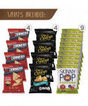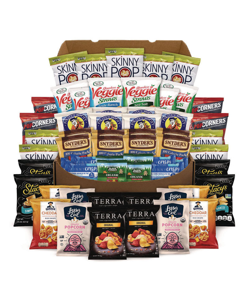 You'll be snacking healthy for days with this Big Healthy Snack Box. Unpack this large snack box and you'll find 61 snacks that will help you avoid overly sugary snacks and candy. Stonyfield Organic Fruit Snacks, Skinny Crispy, Pirate's Booty, Veggie Straws, Snyder's Mini Pretzels, Stacy's Pita Chips, This Popcorn is Awesome, Quaker Popped, and Kellogg's Cracker snacks are all packed into this huge box. Perfect for refilling the cabinets at home, for sharing at your next party, or for offering to employees in the breakroom. Grab one of these Big Healthy Snack Boxes and enjoy the great flavor of healthier snacks. Each Big Healthy Snack Box comes with a smaller snack box inside, with other snack bags on top. Products may vary by flavor per brand and substitutions may be made due to availability.