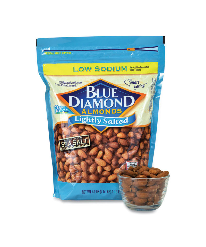 Almonds are a great source of protein, and a healthier choice than most snacks. Now, with low sodium, Blue Diamonds Low Sodium Lightly Salted Almonds are an even better snack to reach for when your midday hunger sets in. Fill your office breakroom, with these nutritious and delicious nuts.