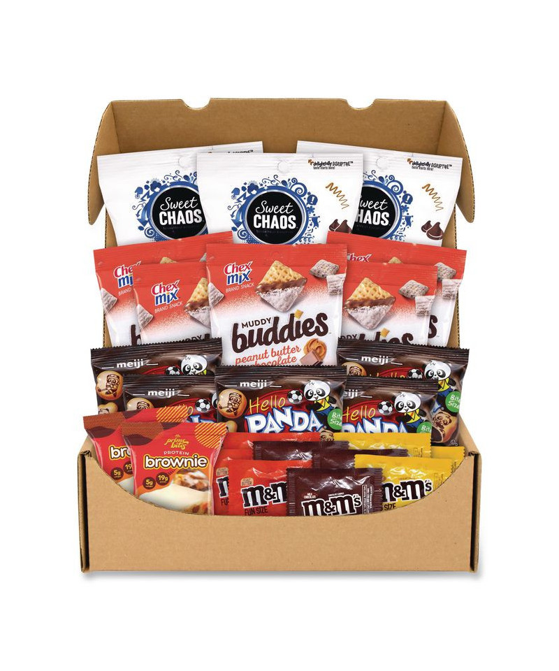 Sweet treats for anytime! Grab some for a crunchy treat with lunch time, break time, and anything in between. This assortment includes a variety of irresistible treats such as Chex Mix Muddy Buddies, Sweet Chaos Peanut Butter Cup popcorn, M&Ms and more. These tasty snacks make perfect items for your pantry and lunchbox.
