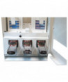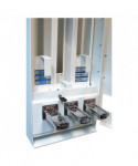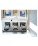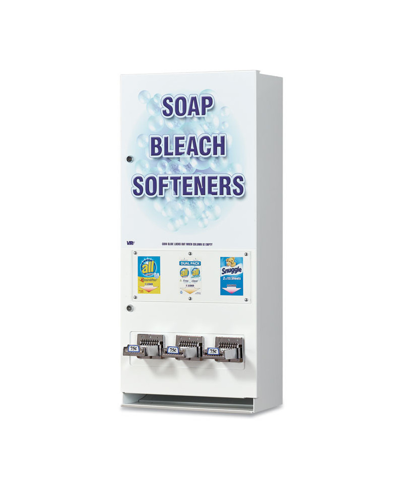 Three-column, coin slide-operated soap vending machine. Offers three different laundry products at a time. Perfect for medium-sized laundry rooms. Holds 69 individually-sized boxes.