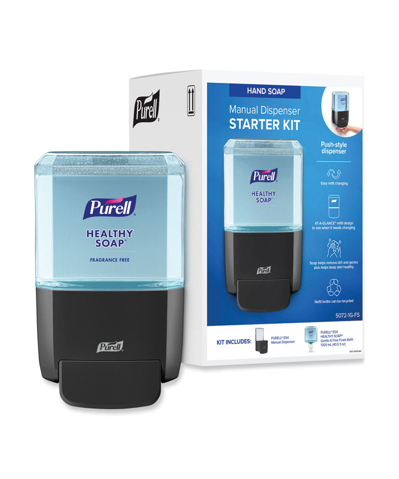 Show you care about well-being with the PURELL® ES4 Push-Style Soap Dispenser and PURELL® Brand HEALTHY SOAP™ Gentle & Free Foam Refill kit. This stylish dispenser makes facility maintenance simple and keeps bathrooms looking modern. Plus, research shows that 80 percent of people said seeing PURELL® products left them with a positive overall impression. PURELL® Brand HEALTHY SOAP™ washes away dirt and germs and keeps skin feeling soft and healthy. PURELL® foam soap rinses clean without leaving drips and messes in the sink. Large size minimizes change outs.