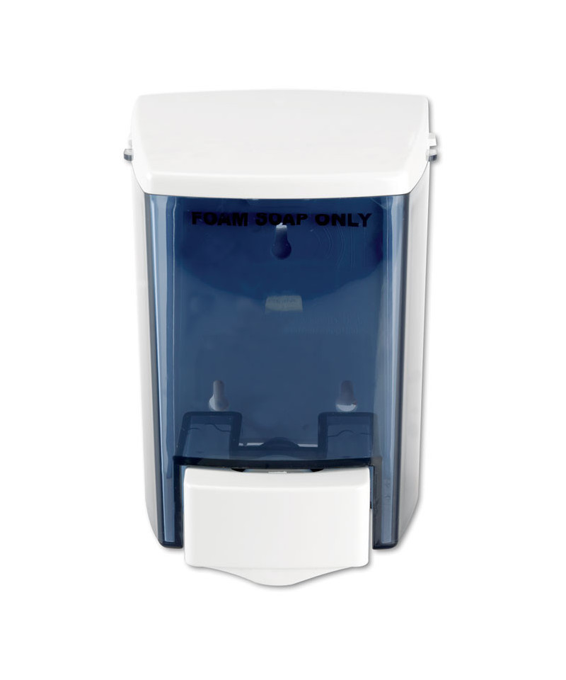 Compact design allows it to fit in tight spaces. Accepts most bulk foaming soap and has a 900-ml capacity. Has a transparent reservoir tank for soap level visibility. Long-lasting foam pump mechanism does not wear out. Dispenser can be easily removed from mounted back plate for cleaning. Mounting tape included.