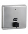 Dispenses all-purpose soaps. One-piece front, satin-finish stainless steel with vessel attached to back. Pulls out for filling. Concealed locking device. Wall to push-button, 1.63".