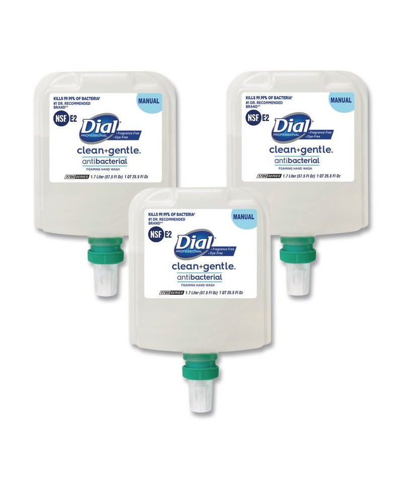 Dial® Professional clean+gentle™ Antibacterial Foaming Hand Wash kills 99.99% of bacteria. It is a gentle, hypoallergenic formula that hydrates and rinses clean without drying your skin. Antibacterial, fragrance-free, dye-free for skin that looks and feels healthy. For use with Dial 1700 Manual Dispensers.