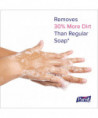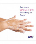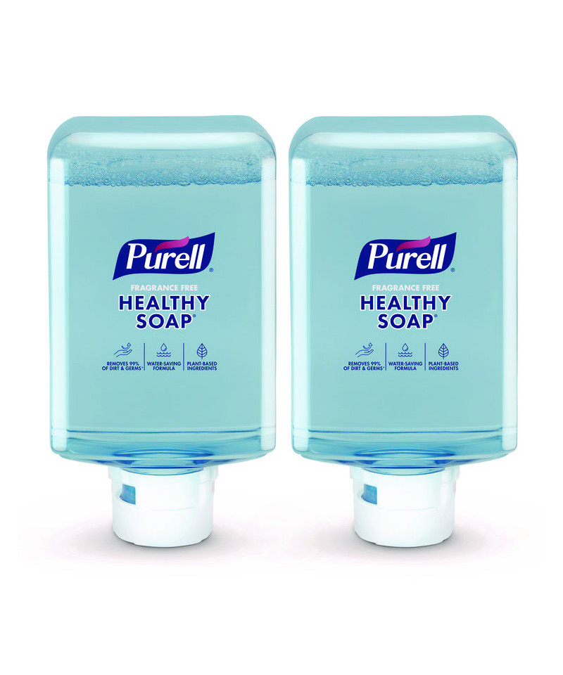 PURELL HEALTHY SOAP™ with CLEAN RELEASE® Technology Fragrance Free Foam is unique. It cleans better than regular soap without harsh preservatives and antibacterials that can cause skin irritation. The patented PURELL® formula reaches into skin's cracks and crevices 2X better than regular soap to lift away more than 99% of dirt and germs. You can see the difference when you wash, as it rinses quickly and cleanly, saving time and each refill saves an estimated six gallons of water compared to regular soap. This a sustainable soap, made with plant-based ingredients and 50% renewable energy. Bottle is made with recyclable plastic components. The collar and alkaline AA battery easily pull apart making it easy to recycle and reduce product waste.