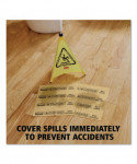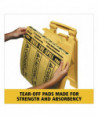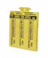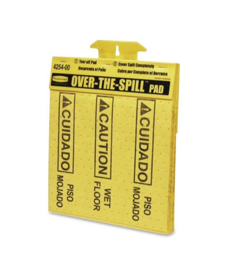 The Rubbermaid Commercial Mini Over the Spill Absorbent Pads Tablet contains 25 absorbent pads that each have a triangular "Caution" symbol as well as the words "Wet Floor" in both English and Spanish. These water and oil absorbent pads are a great way to alert customers of spills, which could cause slips or falls. The tablet backing, constructed of corrugated plastic, mounts on flat surfaces or affixes to wet floor signs for convenient storage. Each spill pad is made from melt-blown polypropylene for added strength and absorbs up to 12 ounces of fluid for efficient cleaning.