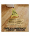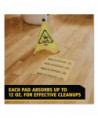 Contains 25 absorbent pads that each have a triangular "Caution" symbol and "Caution Wet Floor" in English and Spanish. Each caution pad absorbs 12 oz. of fluid.