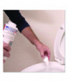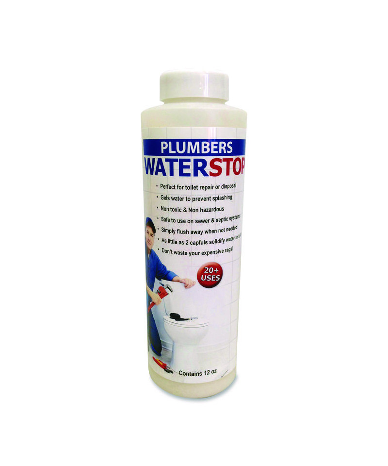 Water Stop is a super absorbent that quickly absorbs and gels water for easier management of toilet repairs.
